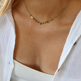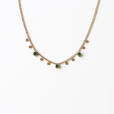- Collier composé d’une chaîne ornée de 3 oxydes de zirconium verts et de petites pastilles dorées