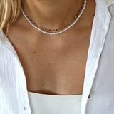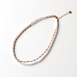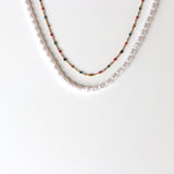 • Collier composé de deux rangs : une chaîne fine aux petites billes colorées et une chaîne aux perles nacrées texturées