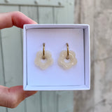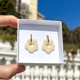 • Boucles d’oreilles composées de deux créoles et de deux fleurs beiges interchangeables ; à mixer à l'infini. Chaque fleur est unique avec ses propres nuances et reflets. Les paires de fleurs peuvent être commandées sans créoles pour les associer à toutes vos tenues.