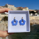 - Boucles d'oreilles composées de deux créoles et de deux fleurs Bleu Ciel interchangeables ; à mixer à l'infini. Chaque fleur est unique avec ses propres nuances et reflets. Les paires de fleurs peuvent être commandées sans créoles pour les associer à toutes vos tenues.
