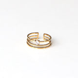 - Bague triple composée de deux rangs lisses et d’un rang texturé au milieu. Elle est surplombée par un oxyde de zirconium blanc