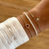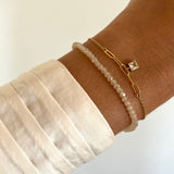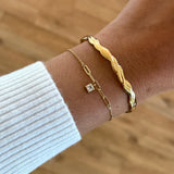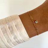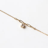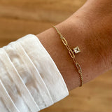 - Bracelet tendance composé d'une chaîne fine et d'une partie de chaîne aux maillons plus larges au milieu ornée d'un oxyde de zirconium carré.